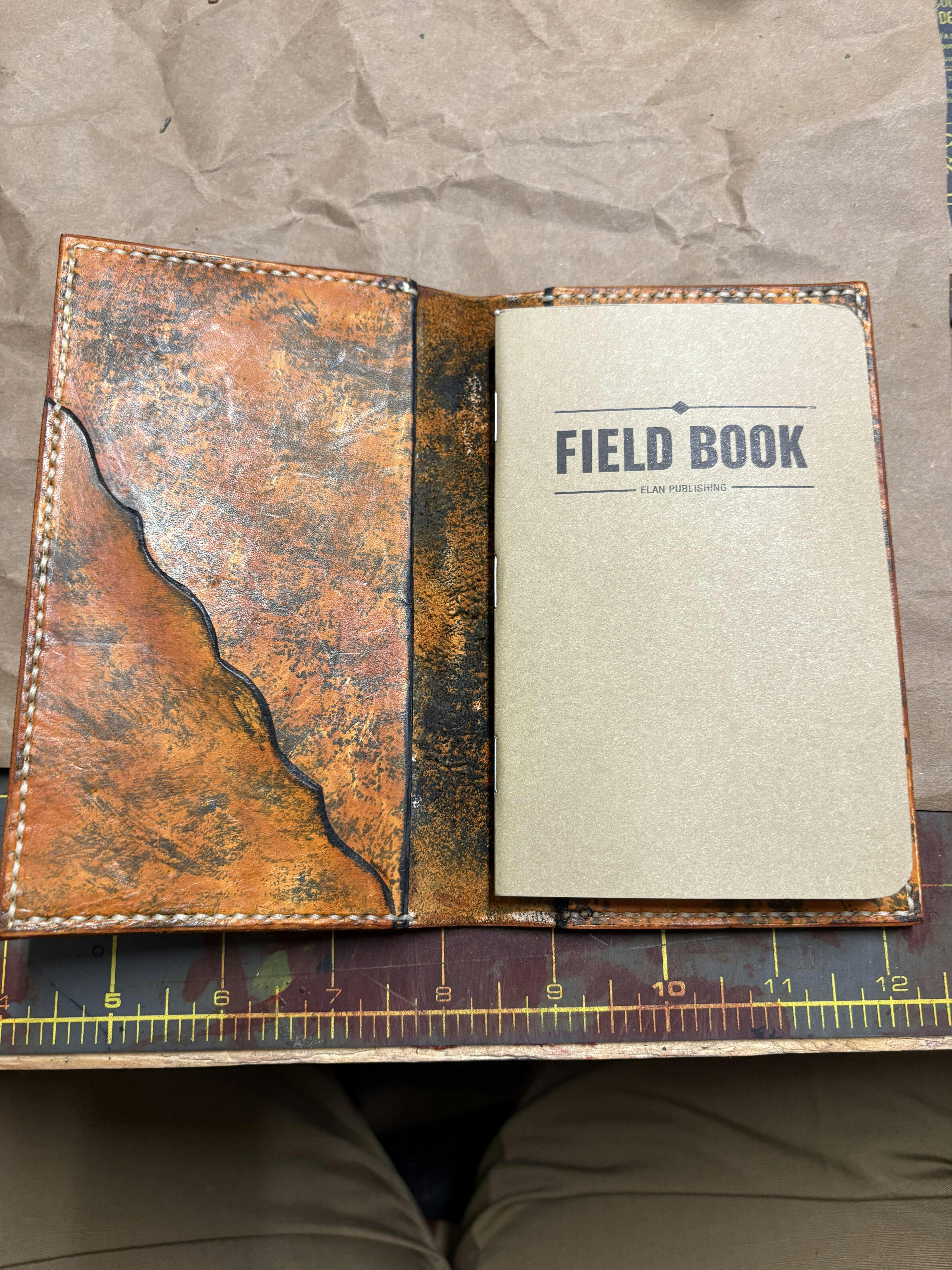 A brown leather notebook cover with a 'FIELD NOTES' embossed on it, displayed on a cutting mat, alongside two blue acrylic templates.